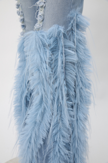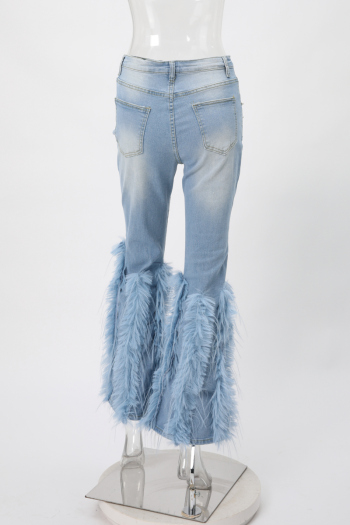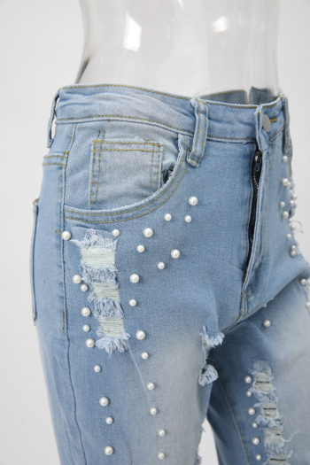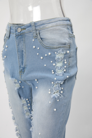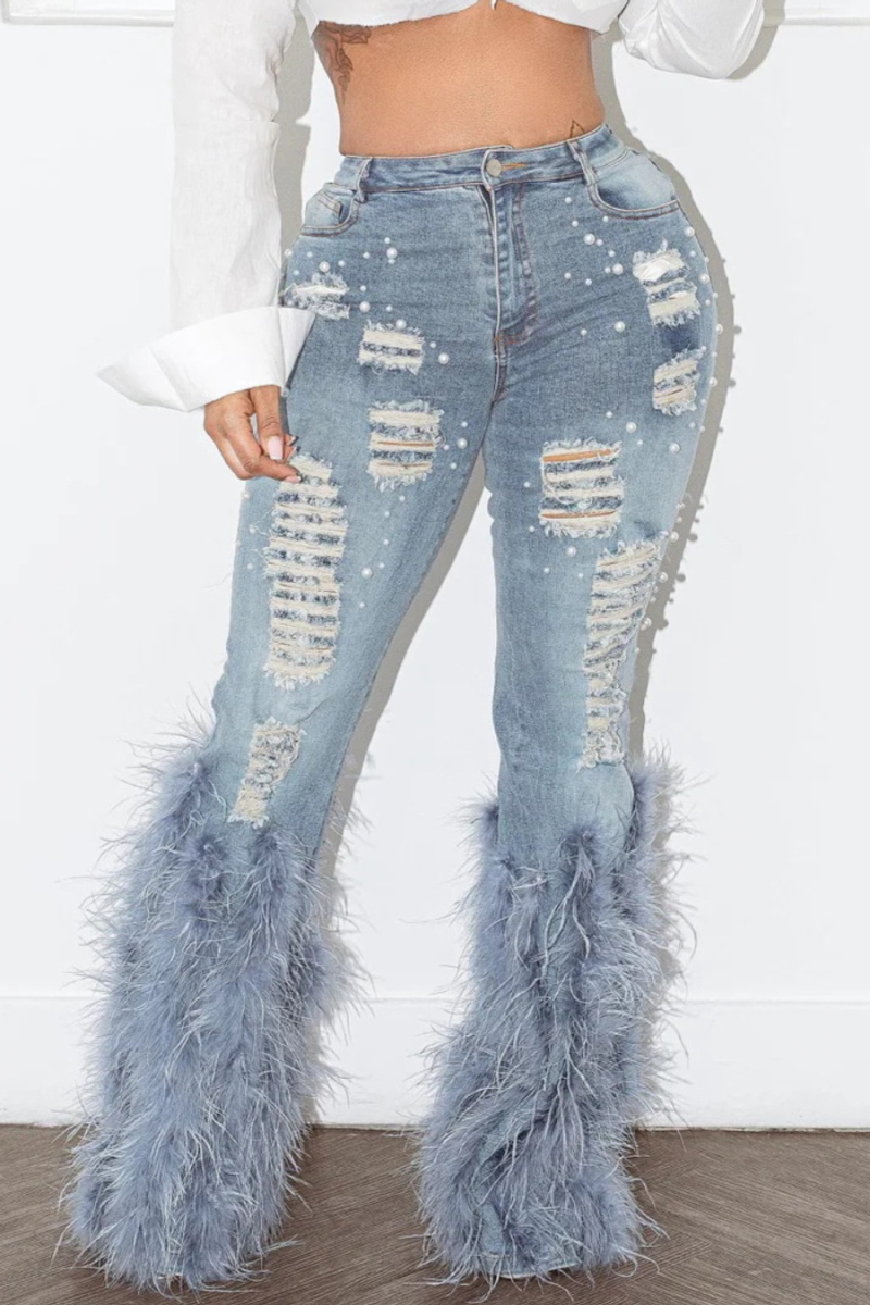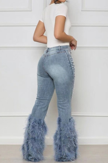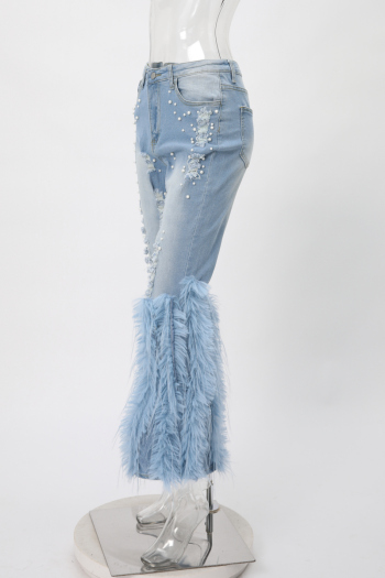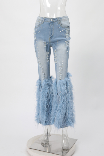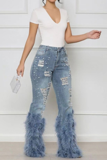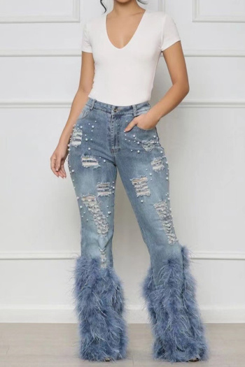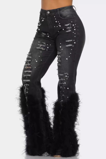 Casual plus size non-stretch hole pearl feather decor pants Wholesale