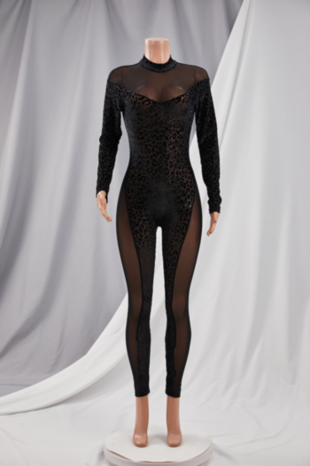 Early autumn three colors see through mesh leopard spliced stretch zip-up back sexy hot skinny jumpsuit Wholesale