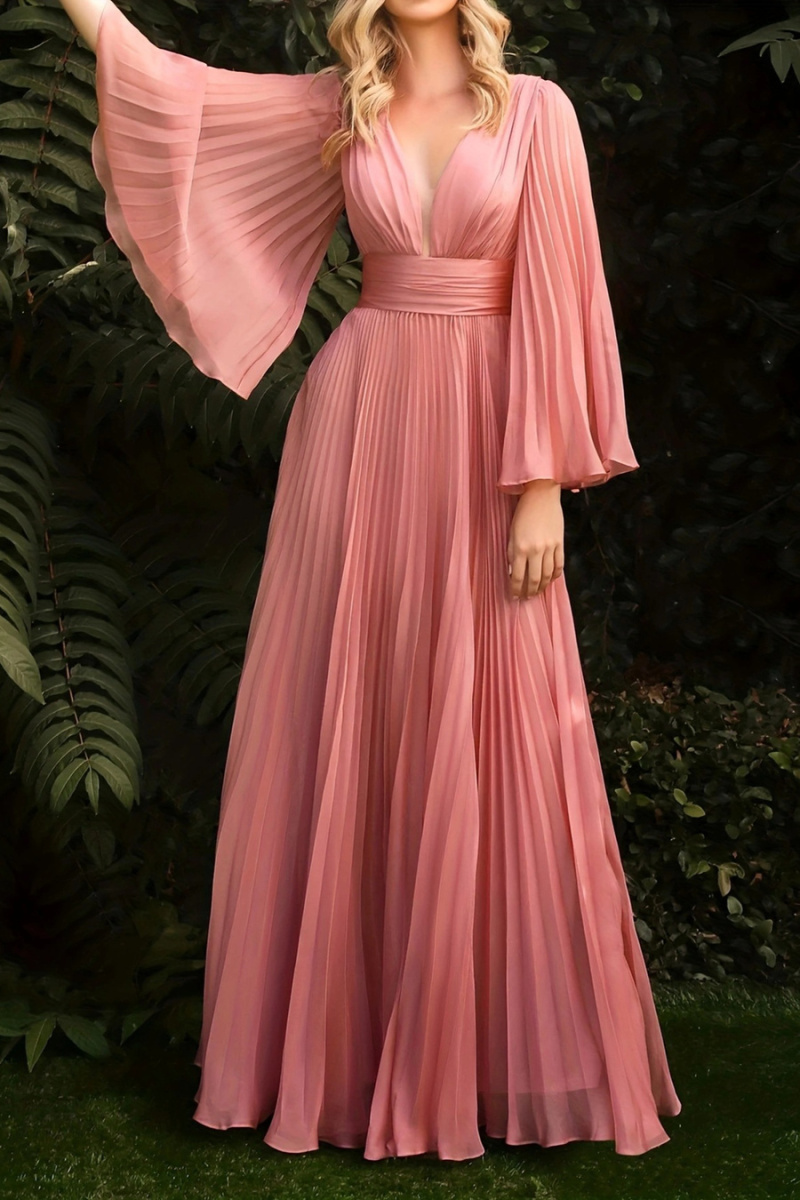 Elegant non-stretch solid color pleated deep v-neck backless maxi dress