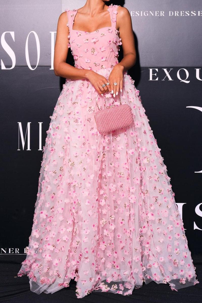 Elegant slight stretch mesh flower appliqued padded with lined maxi dress Wholesale