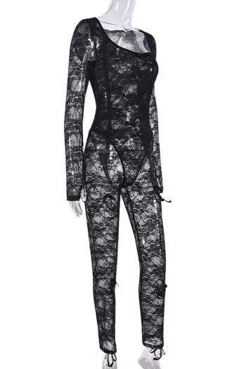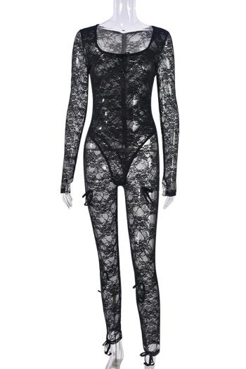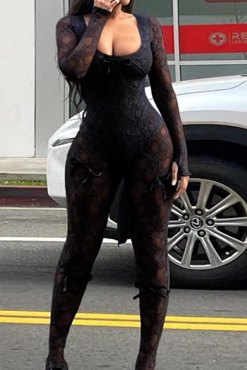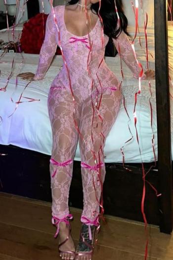 New slight stretch patchwork lace knit see through bow solid color jumpsuit