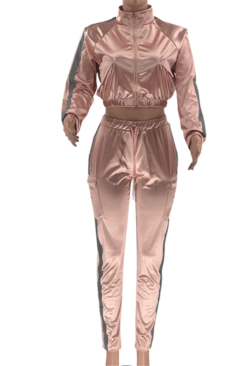 Plus size solid color 7 colors spliced reflective stripes micro elastic zip-up simple two-piece set
