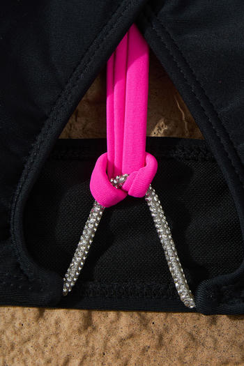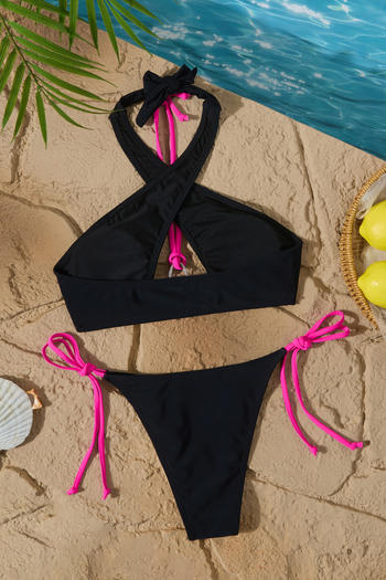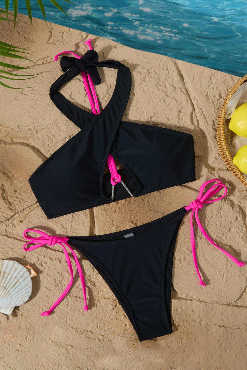 Sexy color-block padded hollow halter-neck lace-up tankini set Wholesale