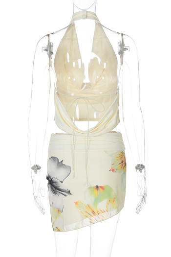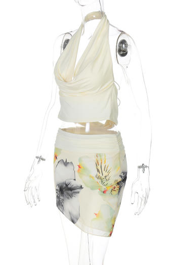 Sexy slight stretch halter-neck flower printing mini skirt sets