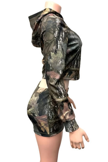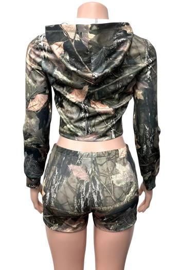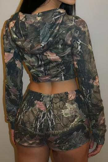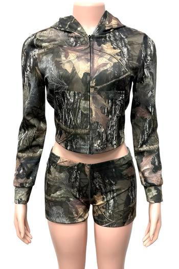 Stylish slight stretch leaf printing zip-up hooded top & shorts set Wholesale